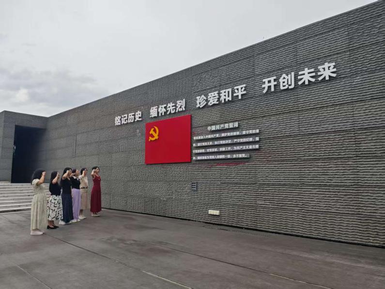 “我志愿加入中国共产党……”在纪念馆广场上,全体党员面对鲜红的党旗,举起右拳庄严宣誓,重温入党誓词。铿锵有力的誓言回荡在广场上空,不仅是对初心使命的重新叩问,更是对责任担当的郑重承诺。